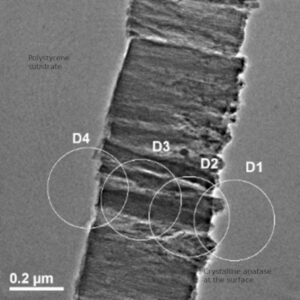 Film de TiO2 anatase en vue transverse par microscopie électronique en transmission