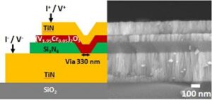 Suite à la découverte réalisée à l’IMN, nous exploitons la possibilité d’induire par pulse électrique une transition résistive non volatile et réversible dans une vaste classe de matériaux : les matériaux de Mott [Brevets 2007, 2012]. Les propriétés de switch résistif induit par pulse électrique ont été validées sur des couches minces de GaV4S8 et V2O3 : Cr (25-500 nm) obtenues par MS (Magnetron Sputtering) [Brevet 2009]. Ces matériaux sont maintenant considérés comme une technologie émergente pour des applications mémoires [Adv. Func. Mat., 2015] et neuromophiques [Adv. Func. Mat., 2017] : la technologie Mott-RAM.