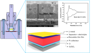 La deuxième classe de matériaux concerne les oxydes conducteurs ioniques de type pérovskites (La0.66TiO3, La0.33NbO3), Wadsley-Roth (TiNb2O7) ou autres structures contenant des chemins de diffusion facilités pour le lithium ou le sodium. Ces matériaux utilisés comme électrodes négatives pour les micro-batteries de puissance, sont obtenus via la co-pulvérisation réactive de plusieurs cibles, suivi d’un recuit sous atmosphère contrôlée. L’objectif est de mieux comprendre les mécanismes de stockage du lithium dans ces structures crystallines. Le dépôt par plasma permet notamment de bien contrôler les compositions et morphologies.