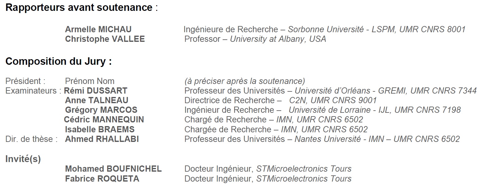 Résumé : Le nitrure de gallium (GaN) est un matériau clé pour les dispositifs de l’électronique de puissance opérant dans le domaine des radiofréquences. La miniaturisation des architectures rend le contrôle nanométrique de la gravure critique. Les procédés usuels de gravure par plasmas froids continus en chimies chlorées, offrent des vitesses élevées mais peuvent induire des défauts dans le matériau, impactant les performances et la fiabilité des dispositifs. La gravure par couches atomiques (ALE), procédé cyclique alternant modification chimique de surface et activation par bombardement ionique de faible énergie, vise à contrôler la gravure à l’échelle atomique tout en améliorant l’état de surface. Cette thèse porte sur le développement d’un modèle multi-échelle de l’ALE du GaN en plasmas Cl₂/Ar. Le simulateur couple un modèle global dynamique décrivant les flux et densités des espèces du plasma et un modèle de gaine Monte-Carlo fournissant les fonctions de distribution en énergie et angulaire des ions. Les résultats issus de ces deux premiers modèles sont ensuite exploités par un modèle de surface Monte-Carlo cinétique pour décrire les réactions de modification induites par le chlore et la sélectivité du bombardement ionique à la surface du GaN durant le procédé ALE. Ce modèle de surface est alimenté par une étude ab initio décrivant les interactions Cl-GaN(0001). L’ensemble du simulateur permet in fine de relier les paramètres mésoscopiques aux interactions plasma/surface à l’échelle atomique afin d’approfondir la compréhension des mécanismes mis en jeu et d’optimiser les performances du procédé comme l’état de surface du GaN post-gravure et le contrôle de l’épaisseur gravée par cycle. A terme, ce travail peut être intégré dans un jumeau numérique de procédés ALE du GaN, afin de guider l’optimisation et l’industrialisation de la gravure à l’échelle atomique.
