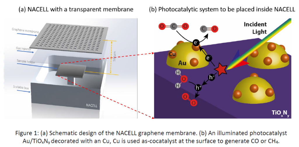 Dans ce projet, le consortium propose de développer un dispositif de cellule à membrane-2D (figure 1a) qui permettra une étude XPS operando sur des films minces à propriétés photocatalytiques et plasmoniques à base d’oxynitrure de titane (TiOxNy). Ces films seront constitués d’éléments abondants sur terre et, leur seront associées des nanoparticules (NPs) d’or (Au) ou de cuivre (Cu) pour permettre une réduction photocatalytique du CO2 en phase gazeuse. Afin d’atteindre cet objectif, une cellule dédiée sera conçue et réalisée et des protocoles expérimentaux pour effectuer une caractérisation de routine des matériaux photocatalytiques seront également développés.