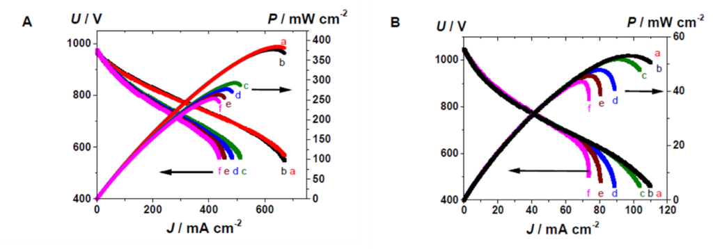 Voltage and power density versus current density characteristics of the cell 107.10 recorded at 10 mV s-1 under air on the cathode side and (A) wet (3% H2O) 15% H2-15%CO-10%CO2-50%N2 mixture on the anode side at 850 °C (A) and 600 °C (B) containing H2S concentrations of 0 ppm (a), 1 ppm (b), 2 ppm (c), 3 ppm (d), 4 ppm (e) and 5 ppm (f).
