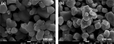 Figure 1. SEM images of (Pr0.5Ba0.5)0.95Mn0.95Ni0.05O3−δ, before and after reduction