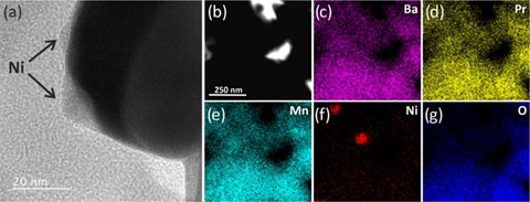 Figure 2. (Pr0.5Ba0.5)0.95Mn0.95Ni0.05O3−δ: (a) HRTEM highlighting two nanoparticles on the oxide support, (b) bright-field image, and (c−g) STEM-EDS elemental mapping images.