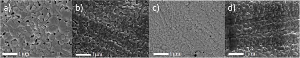 SEM images are obtained on non-calcined samples directly sintered at 1400 °C for 10 h, cross-sectioned, polished, cleaned with ethanol, and with a thermally etched at 1350 °C for 3 h: a) BaZr0.4Ce0.4Y0.1Yb0.1O3-δ reference pellet, b) BaZr0.4Ce0.4Y0.1Yb0.1O3-δ + 0.5 wt% ZnO, c) BaZr0.4Ce0.4Y0.05Yb0.1Zn0.05O3-δ, d) BaZr0.4Ce0.4Y0.075Yb0.075Zn0.05O3-δ, highlighting the impact of doping and sintering strategies on porosity and grain morphology